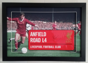 Framed Street Plaque Signed By Kenny Dalglish Framed With A Printed Background And Finished Off With A Black Frame